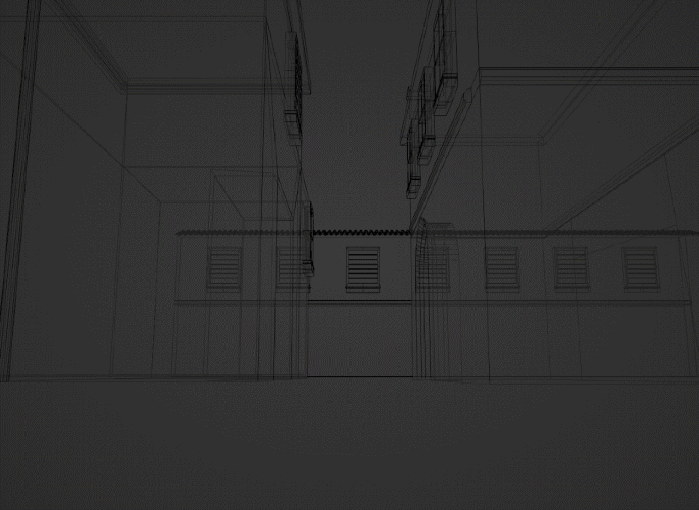 Il processo consiste nell’estrarre le coordinate della camera dalla fotografia attraverso il software open source F-Spy. Dopodiché la finta camera viene importata in Blender con la foto impostata come background e da lì si iniziano a modellare i vari piani seguendo le linee prospettiche. L’intero ambiente è stato realizzato estrudendo e suddividendo un unico cubo. Gli altri elementi da modellare sono stati gli stipiti dei muri, estrudendo gli edge e applicando un Solidify, e le porte delle celle, che consistono unicamente di parallelepipedi e cilindri low poly intersecati.