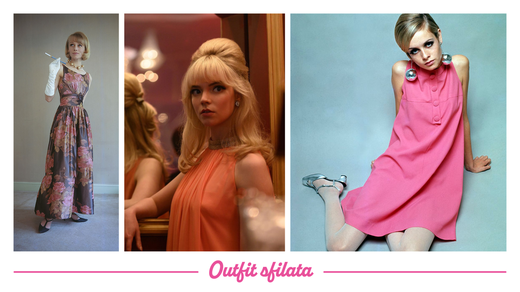 Il primo outfit è composto da indumenti semplici e quotidiani per far capire che la protagonista non è avvezza a compiere furti. L’outfit della sfilata invece è elegante ed esagerato, e i colori sono le tinte forti della moda dell’epoca. L’abito a collo alto con gonna svasata è ispirato allo stile di Twiggy e al mini-dress indossato da Sandie in Last Night in Soho. A differenza delle reference, però, abbiamo allungato l’abito fino alle caviglie in modo tale da avere effetti più interessanti nella collisione con gambe e piedi. I guanti bianchi e le scarpe argentate completano l’outfit contribuendo all’impressione di eleganza e ricchezza.